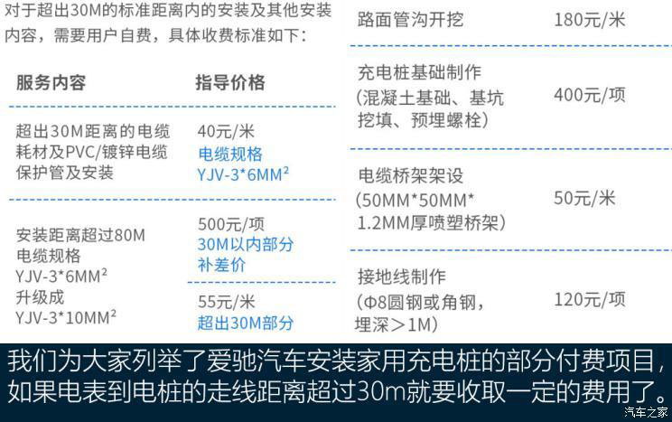 在充電樁安裝費(fèi)用方面,愛馳汽車與吉利新能源的收費(fèi)標(biāo)準(zhǔn)基本相同,若電表到充電樁超出30m安裝距離及標(biāo)準(zhǔn)安裝內(nèi)容,超出部分的費(fèi)用由用戶自行承擔(dān)。如果你也有像許博老師一樣的需求,即增加充電樁到充電槍的線束長度,相信也是付費(fèi)項(xiàng)目,具體可以向施工方咨詢。