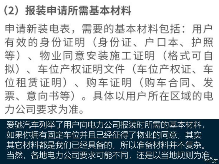如果家中電力容量不足,愛馳建議可以向國家電網(wǎng)或南方電網(wǎng)申請安裝獨(dú)立電表,即在“網(wǎng)上國網(wǎng)App”或“南方電網(wǎng)App”中選擇充電樁報(bào)裝或低壓報(bào)裝,申請過程中需要用戶提交相關(guān)證明材料,其中包括用戶身份證明、物業(yè)同意安裝證明、車位產(chǎn)權(quán)證明以及購車證明等。