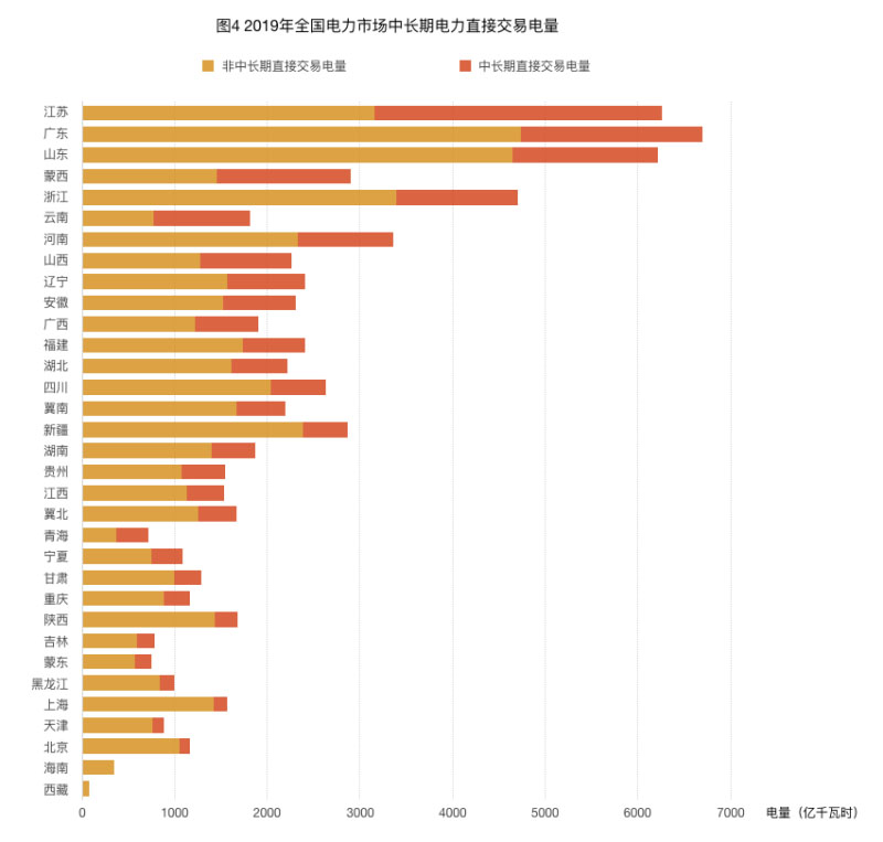 如圖4所示,從2019年中長期電力直接交易電量規(guī)模來看,江蘇、廣東和山東分別位列前三位,而廣東、山東的非中長期直接交易電量遠(yuǎn)高于江蘇。
