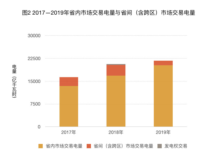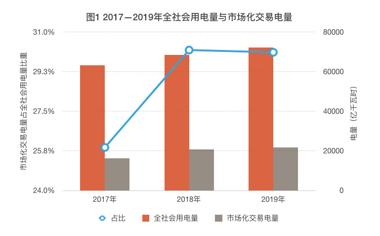 如圖1所示,2017年—2019年,全國市場化交易電量規(guī)模逐年擴(kuò)大,但市場化交易電量占全社會用電量的比重有所下降。2019年,市場化交易電量占全社會用電量比重達(dá)到30.1%,但相比2018年下降了0.1%。