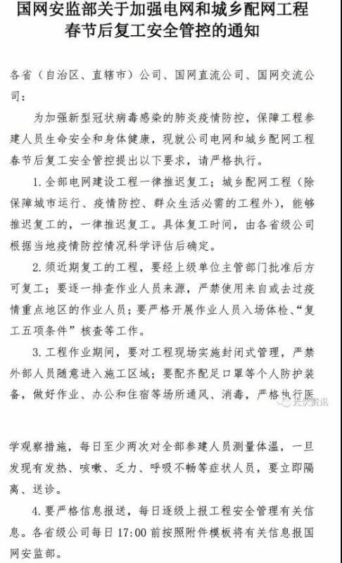 1月28日,國(guó)家電網(wǎng)安監(jiān)部印發(fā)《關(guān)于加強(qiáng)電網(wǎng)和城鄉(xiāng)配套工程春節(jié)后復(fù)工安全管控的通知》,文件指出:全部電網(wǎng)建設(shè)工程一律推遲復(fù)工,城鄉(xiāng)配網(wǎng)工程能夠推遲復(fù)工的一律推遲復(fù)工。