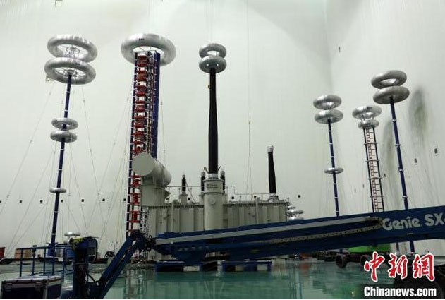 圖為±800千伏青豫特高壓直流工程青南換流站首臺(tái)變壓器正在國網(wǎng)青海電力高海拔高電壓實(shí)驗(yàn)室高壓試驗(yàn)大廳進(jìn)行出廠試驗(yàn)。 謝莉蓉 攝