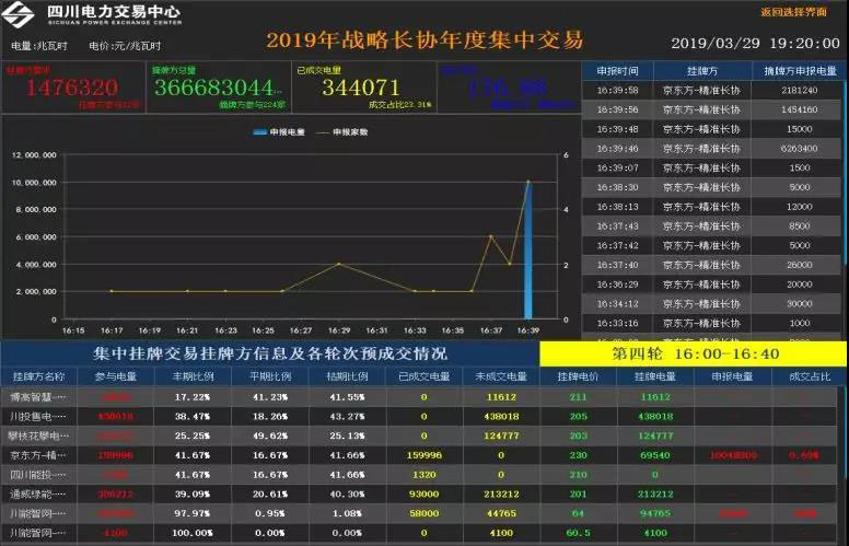 2019年12家掛牌方、224家摘牌方參與平臺戰(zhàn)略長協(xié)年度集中交易,共計開展四輪。掛牌方需求1476320兆瓦時,摘牌方總量366683044兆瓦時,四輪累計成交量344071兆瓦時,成交占比23.31%,成交時間集中在交易的開始和結(jié)束時段。成交價格高出預(yù)期套多,以京東方為例,在結(jié)構(gòu)5:2:5前提下,以230元/兆瓦時成交159996兆瓦時電量,而5:2:5結(jié)構(gòu)在當(dāng)前多家售電企業(yè)預(yù)期中單價為195元/千瓦時(測算時,戰(zhàn)略長協(xié)5:2:5結(jié)構(gòu)一般參考該數(shù)值),成交價格高出預(yù)期23.08%。