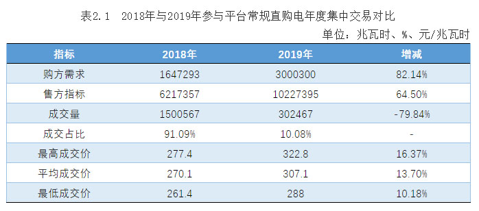 參與平臺常規(guī)直購電年度集中交易的購方需求、售方指標(biāo)、價格均大幅上漲,成交量、成交占比急劇下滑,詳見表2.1。
