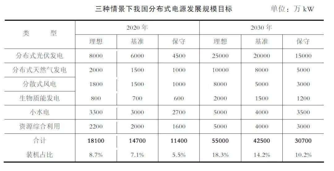 根據(jù)國(guó)家《能源發(fā)展“十三五”規(guī)劃》《2014—2020 年能源行動(dòng)計(jì)劃》《可再生能源發(fā)展“十三五”規(guī)劃》《電力發(fā)展“十三五”規(guī)劃》相關(guān)內(nèi)容,2020 年分布式光伏發(fā)電、分布式天然氣發(fā)電開(kāi)發(fā)規(guī)模達(dá)到國(guó)家規(guī)劃目標(biāo),2030 年分布式光伏發(fā)電、分布式天然氣發(fā)電開(kāi)發(fā)規(guī)模應(yīng)滿足實(shí)現(xiàn)國(guó)家戰(zhàn)略目標(biāo)的要求;分散式風(fēng)電、生物質(zhì)能發(fā)電、小水電和資源綜合利用開(kāi)發(fā)規(guī)模達(dá)到相關(guān)規(guī)劃或資源量約束目標(biāo)。
