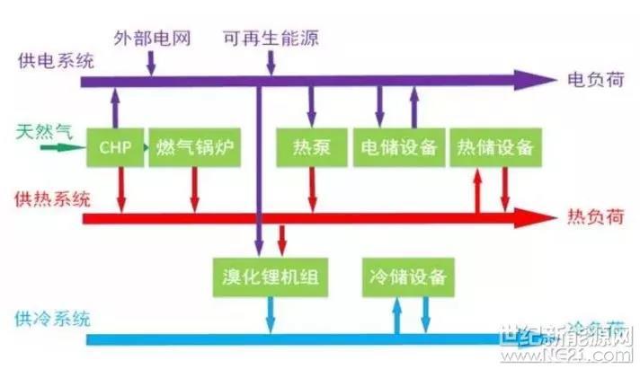 橫向來看依次是源網(wǎng)荷儲。源側(cè)包括常規(guī)的供電設(shè)備、CHP機(jī)組、燃?xì)忮仩t等設(shè)備,以及外部電網(wǎng)供電、可再生能源接入;網(wǎng)架分為冷熱電等傳輸系統(tǒng);荷側(cè)為園區(qū)內(nèi)部的電、熱、冷負(fù)荷;在儲能方面,不同能源子系統(tǒng)均有各自的儲能設(shè)備??v向來看依次是電、氣、熱、冷多能互補(bǔ)運(yùn)行。不同的能源子系統(tǒng)分別用不同的顏色表示,多種能源轉(zhuǎn)化設(shè)備(熱泵、CHP、燃?xì)忮仩t、溴化鋰機(jī)組)將不同的能源子系統(tǒng)相耦合。園區(qū)內(nèi)部多種能源形式以虛擬電廠的形式組合在一起綜合運(yùn)行,在保證電、熱、冷負(fù)荷可靠供應(yīng)的前提下,實(shí)現(xiàn)了能源的梯級利用,提高能效,降低用能成本。并且對于波動性很強(qiáng)的可再生能源而言,綜合能源系統(tǒng)具有更多的靈活性,促進(jìn)了可再生能源的接納,進(jìn)一步提高系統(tǒng)經(jīng)濟(jì)性。