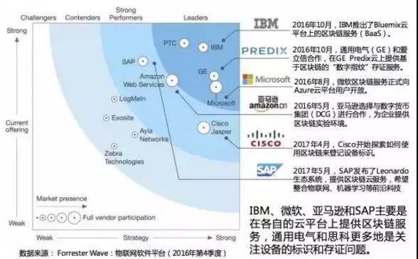 同時,物聯(lián)網(wǎng)龍頭企業(yè)已經(jīng)在積極布局區(qū)塊鏈了。根據(jù)Forrester wave的物聯(lián)網(wǎng)報告顯示:IBM、PTC、GE、思科和微軟已成為占據(jù)物聯(lián)網(wǎng)平臺市場的主導(dǎo)企業(yè)。IBM、微軟、亞馬遜和SAP都在各自的物聯(lián)網(wǎng)云平臺上提供區(qū)塊鏈技術(shù)相關(guān)服務(wù),為未來海量的物聯(lián)網(wǎng)設(shè)備接入提供彈性資源池,做了超前布局。