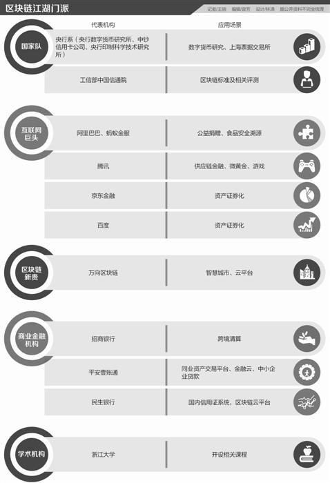 21世紀(jì)經(jīng)濟(jì)報(bào)道記者觀察梳理并與業(yè)內(nèi)人士交流了解到,目前在區(qū)塊鏈技術(shù)研究領(lǐng)域有幾大“門派”:以央行系三家如中鈔信用卡公司、央行印制科學(xué)技術(shù)研究所、央行數(shù)字貨幣研究所以及工信部中國信息通信研究院等為代表的國家隊(duì);以螞蟻金服、騰訊、百度、京東、網(wǎng)易為代表的互聯(lián)網(wǎng)巨頭陣營;區(qū)塊鏈新貴如萬向區(qū)塊鏈股份公司;此外還有如中國銀行、平安銀行(平安壹賬通)、民生銀行、招商銀行為代表的商業(yè)金融機(jī)構(gòu),以及學(xué)術(shù)機(jī)構(gòu)如浙江大學(xué)等。