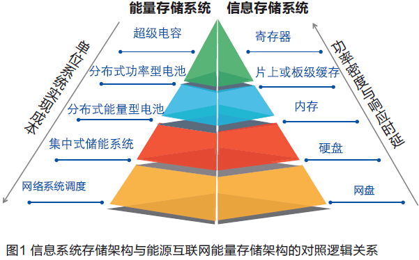 此外,能源互聯(lián)網(wǎng)中分布式儲(chǔ)能系統(tǒng)是分布式能源接入傳統(tǒng)能源系統(tǒng)的必要設(shè)備,所以分布式儲(chǔ)能系統(tǒng)的功能和性能定義應(yīng)與分布式能源接入需求匹配,正如信息領(lǐng)域中信息存儲(chǔ)系統(tǒng)的多樣性對(duì)應(yīng)于信息處理的不同要求。如圖所示,類(lèi)似于信息存儲(chǔ)架構(gòu)從最上層的寄存器到最下層的互聯(lián)網(wǎng)存儲(chǔ),自上而下的單位存儲(chǔ)成本是逐步遞減的,但存儲(chǔ)系統(tǒng)的響應(yīng)速度和延遲中斷性能卻不斷增大,能源互聯(lián)網(wǎng)儲(chǔ)能系統(tǒng)架構(gòu)具有同樣的特征。能源互聯(lián)網(wǎng)中能量存儲(chǔ)系統(tǒng)的構(gòu)建需要應(yīng)對(duì)各種分布式電源無(wú)序隨機(jī)接入傳統(tǒng)電網(wǎng)的要求,我們需要引入軟件定義能量管控系統(tǒng),做到不同種類(lèi)的能量存儲(chǔ)系統(tǒng)搭配使用,以達(dá)到降低單位成本,優(yōu)化系統(tǒng)性能的目的。